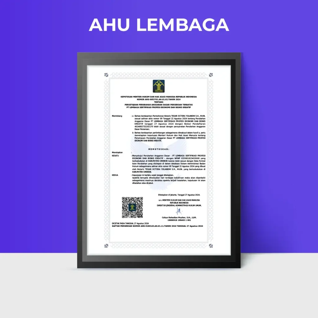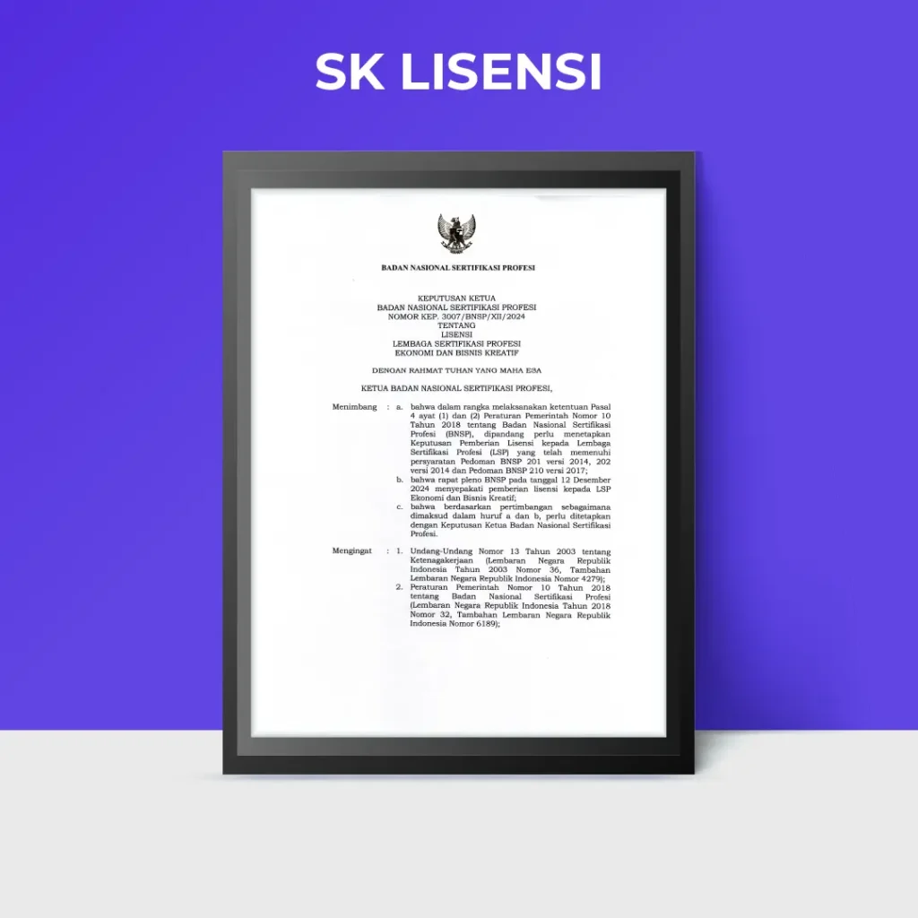 Sertifikat kompetensi yang diakui secara nasional untuk meningkatkan kredibilitas dan daya saing.