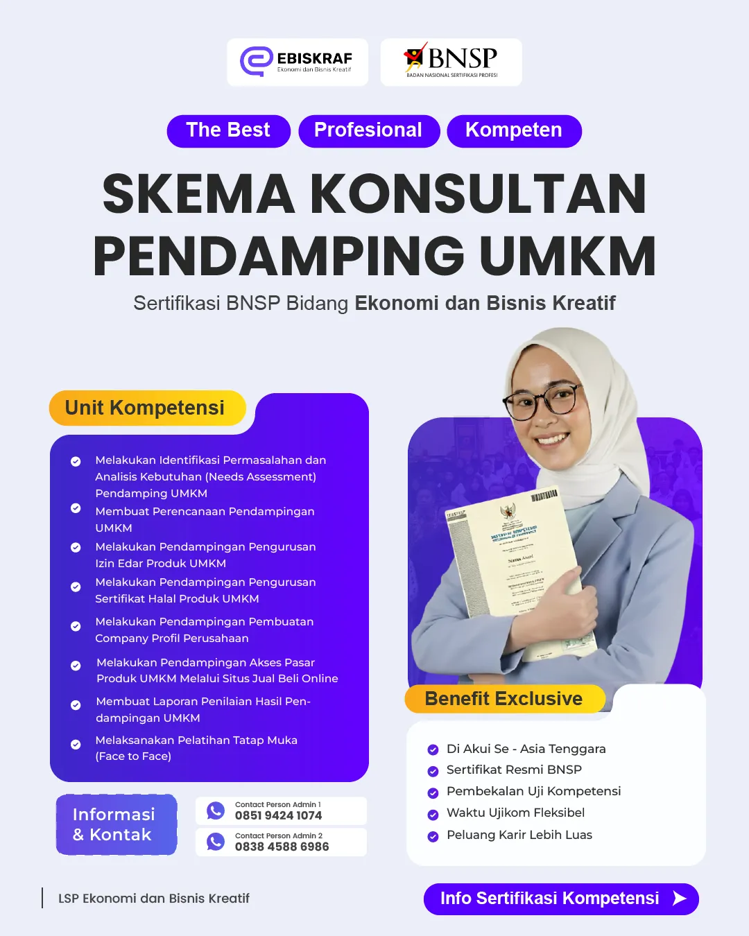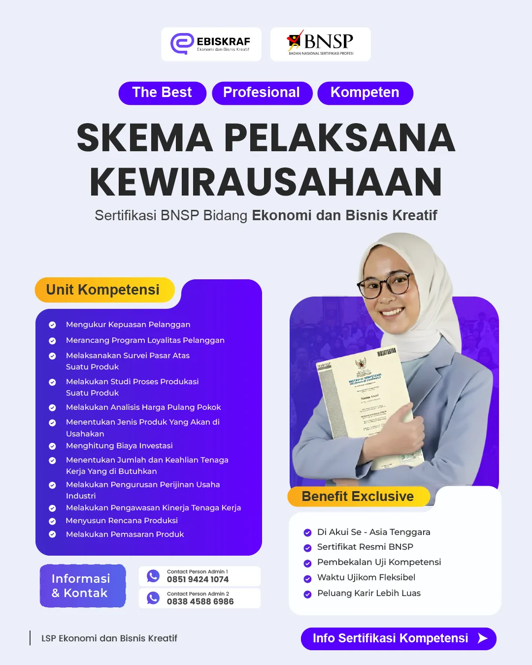 LSP Ebiskraf menghadirkan program sertifikasi kompetensi berlisensi BNSP untuk memastikan keahlian Anda siap jadi Profesional.